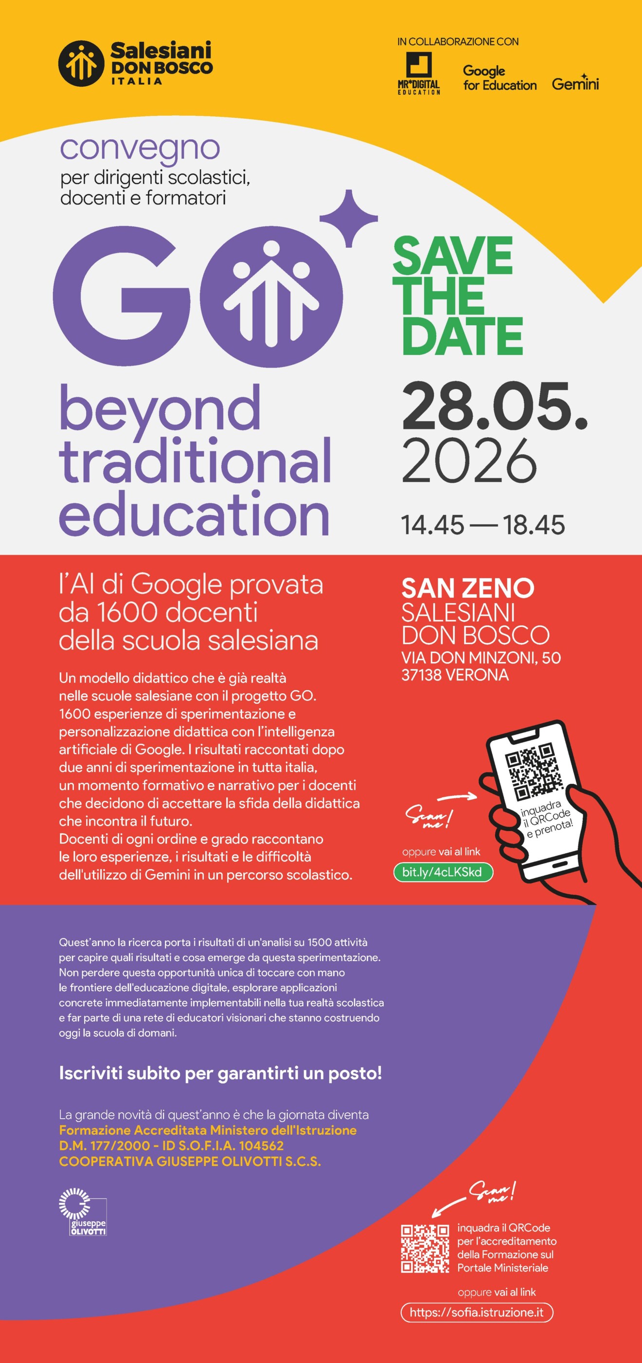 Il convegno “GO Beyond Traditional Education” – per riportare e condividere i risultati del progetto tra le scuole salesiane d’Italia e Google Education – si svolgerà a Verona il 28 maggio. Dopo due anni di sperimentazione su scala nazionale, oltre 1600 docenti delle scuole salesiane hanno già testato e applicato modelli innovativi basati sull’AI di Google, trasformando la pratica educativa quotidiana. Durante il convegno verranno presentati risultati reali, esperienze dirette e analisi approfondite su oltre 1500 attività didattiche.