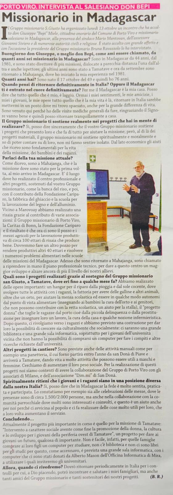 Il Gruppo missionario S. Giusto ha organizzato lunedì 13 ottobre un incontro che ha accolto don Giuseppe “Bepi” Miele, cittadino onorario del Comune di Porto Viro e missionario salesiano in Madagascar, alla presenza del sindaco Mario Mantovan, dell’assessore Giovanni Siviero e di numerose autorità civili e religiose. È stato accolto con grande affetto e con l’occasione la presidente del Gruppo missionario Bruna Ravazzolo lo ha intervistato.