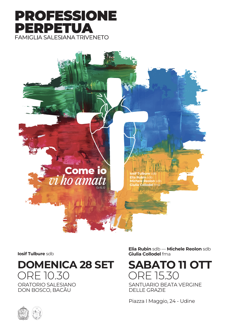Elia Rubin sdb, Michele Reolon sdb e Giulia Collodel fma emetteranno la loro Professione Perpetua, scegliendo di donare definitivamente la propria vita a Dio secondo lo spirito di Don Bosco e di Maria Domenica Mazzarello. Sarà una celebrazione di fede e di gioia, un segno concreto della speranza che continua a germogliare nella Chiesa e nella Famiglia Salesiana.